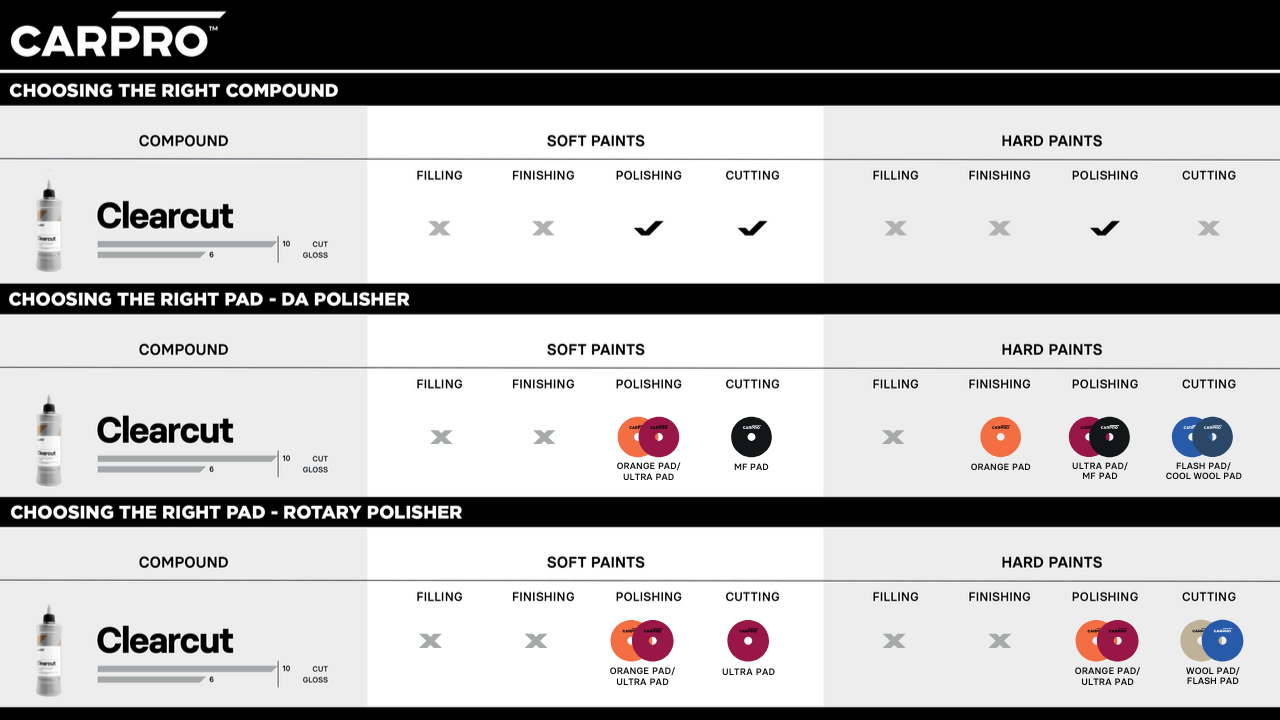 Unlike compounds of the past, CARPRO ClearCut has its own method of application for optimal results... reversing the traditional "heavy to light" method, we start with lighter pressure and finish heavy! Additionally I find myself using a bit more compound with ClearCut than I do with traditional compounds. While ClearCut cuts like a Ginsu, it is also low dusting and wipes off with ease! Say goodbye to hours of wasted time and hello to efficiency and less labor costs!